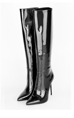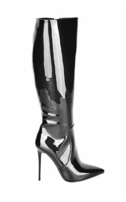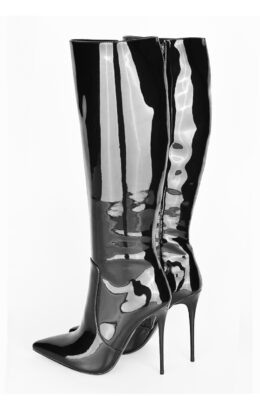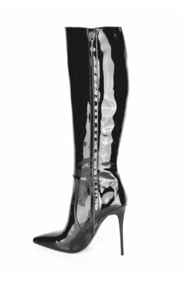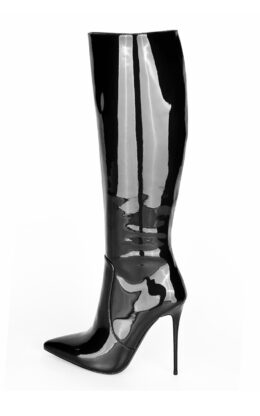 12公分鞋跟 黑色珠光漆皮 小尖头 经典及膝靴