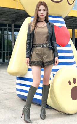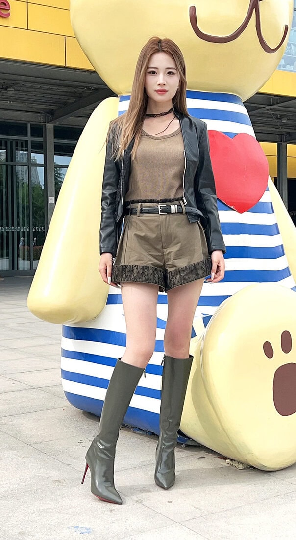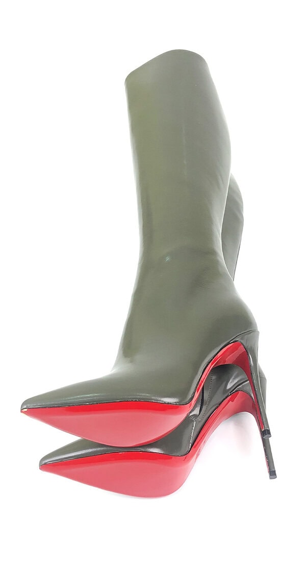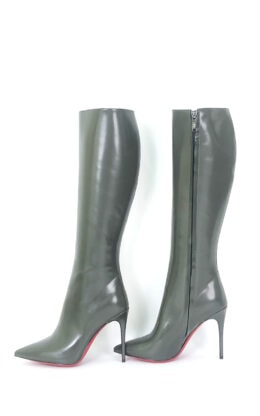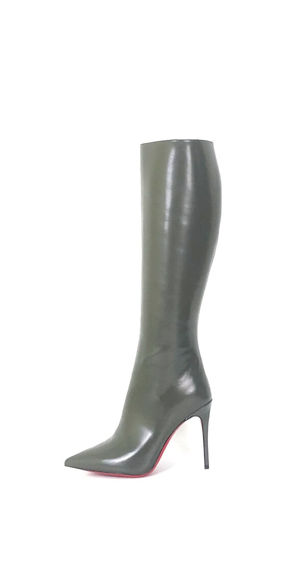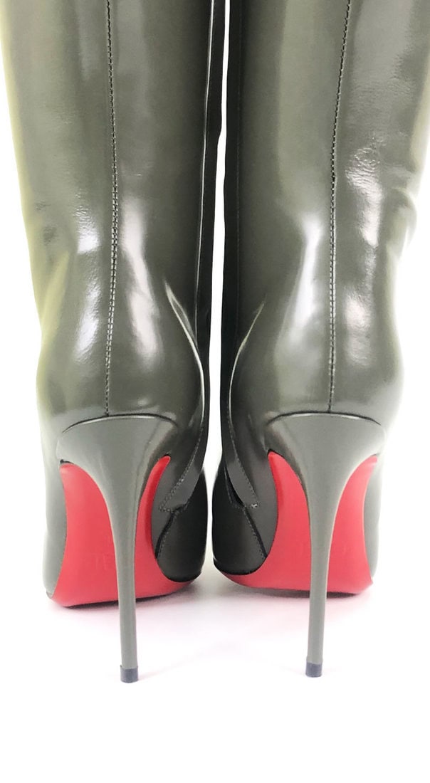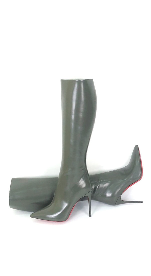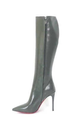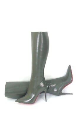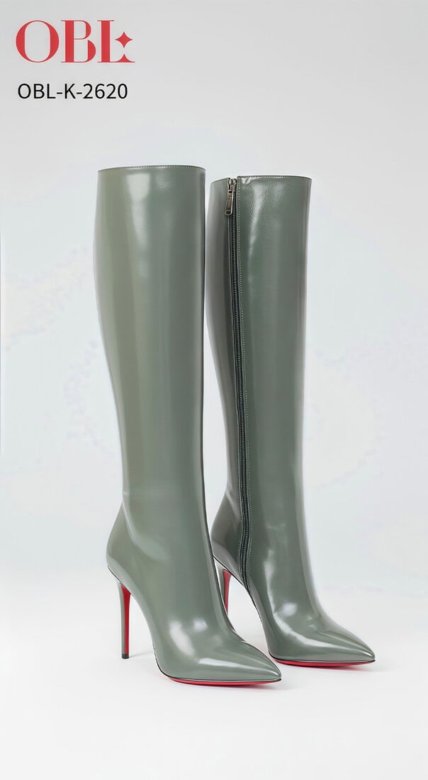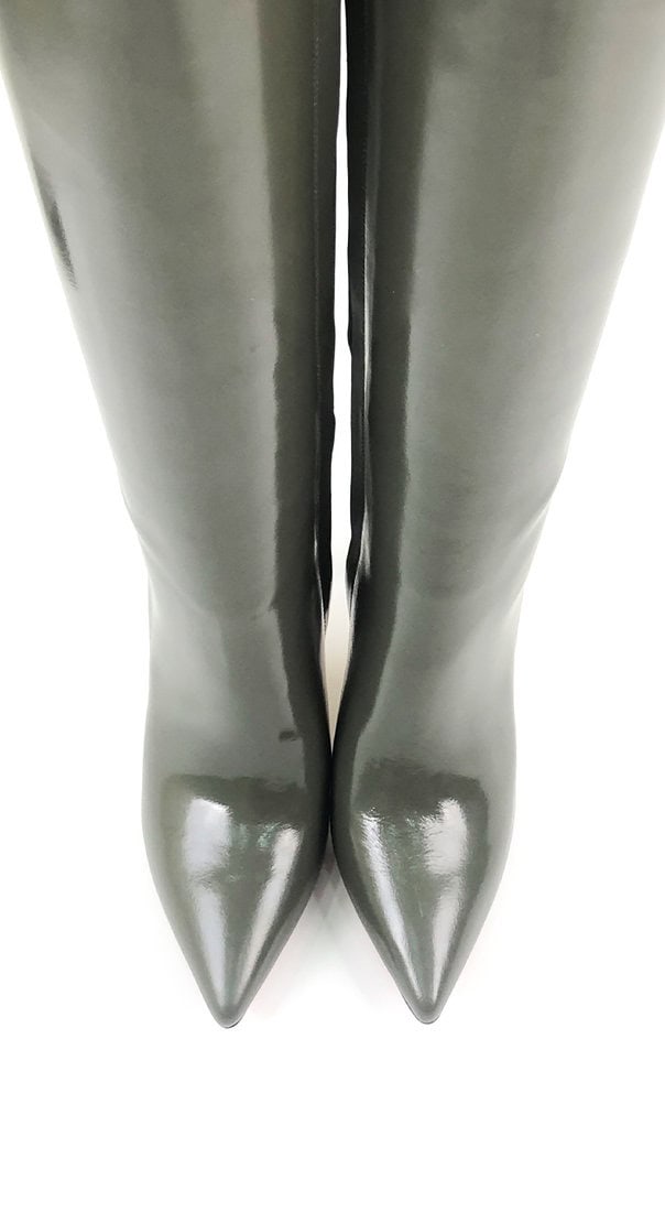 10公分细跟 高光泽烟灰绿色开边珠牛皮 标准短尖头及膝靴