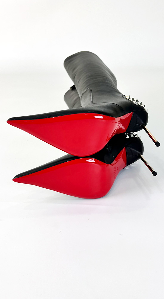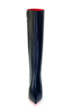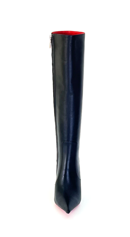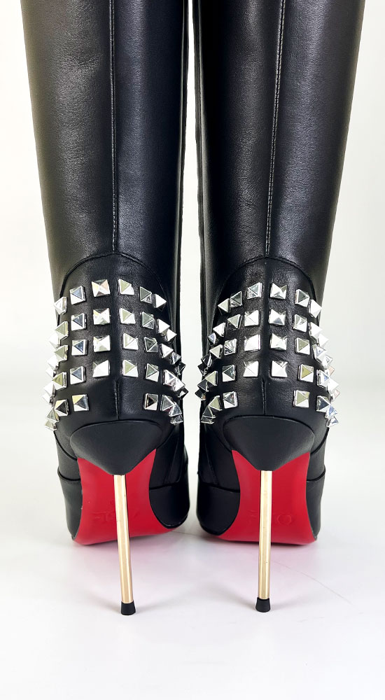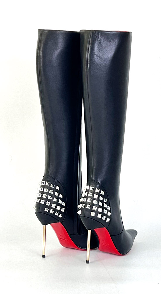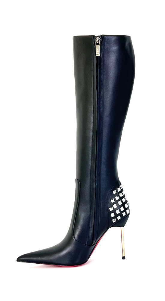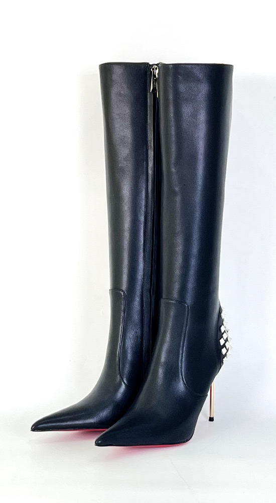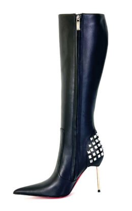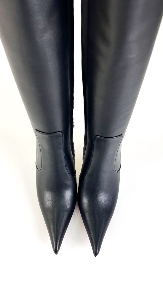 11公分金色金属细跟黑色高品质混种羊皮长尖头及膝靴