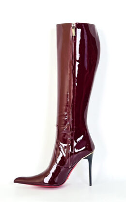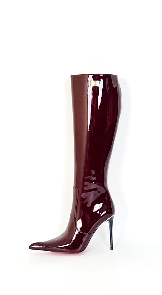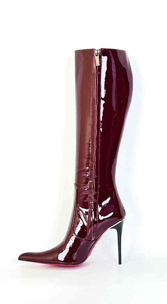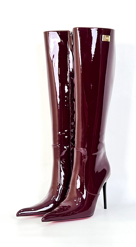 12公分细跟 无水台 高光泽酒红色无弹力漆皮 长尖头及膝靴