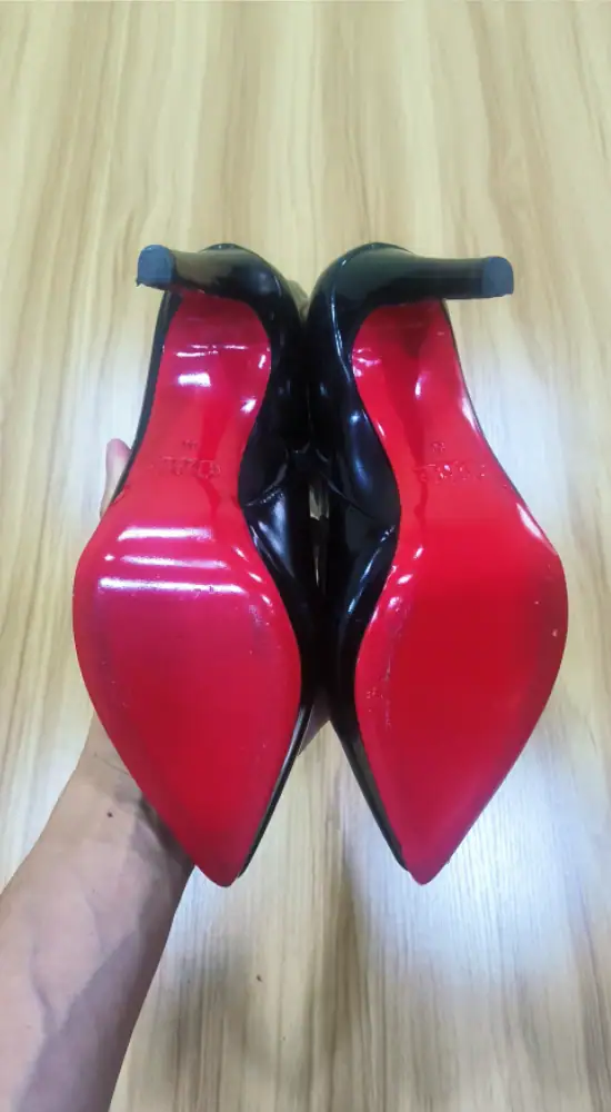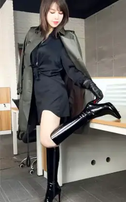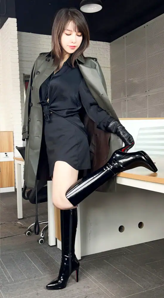 11公分细跟 1公分防水台 小尖头高光泽黑色开边珠牛皮及膝靴