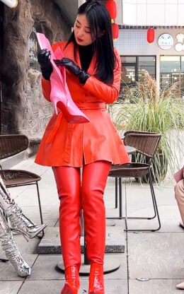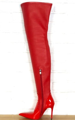 11公分鞋跟 红色高品质弹力羊皮 长尖头过膝靴 鞋尖漆皮拼接