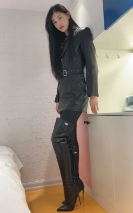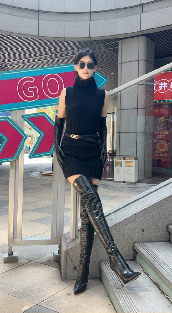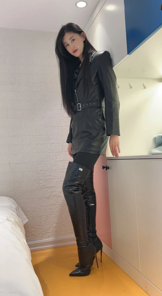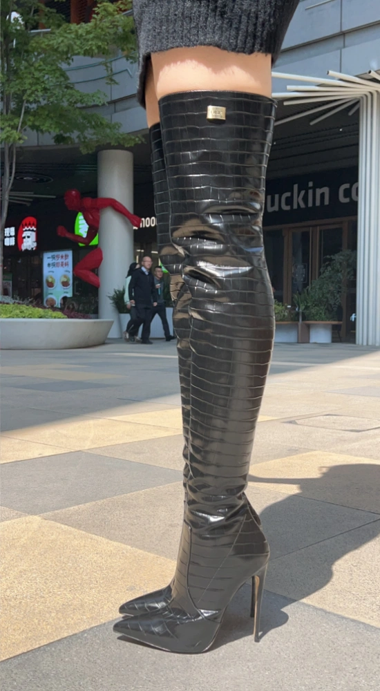 13公分细跟 黑色高光泽压纹牛皮 小尖头过膝靴 靴筒顶部小号金属LOGO