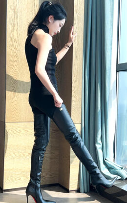 11公分细跟 黑色高光泽头层牛皮 长尖头贝壳靴 整皮无拼接