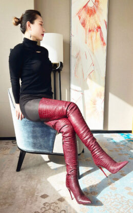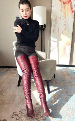 12CM鞋跟 棕红色 小尖头 高品质牛皮 蟒蛇压纹 大腿靴