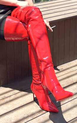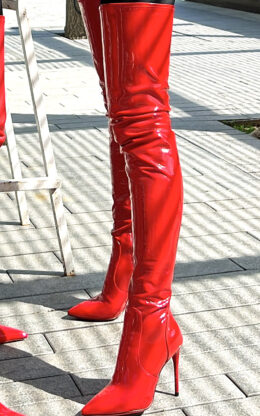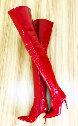 38码 红色高品质弹力漆皮 10cm高跟 长尖头 大腿靴