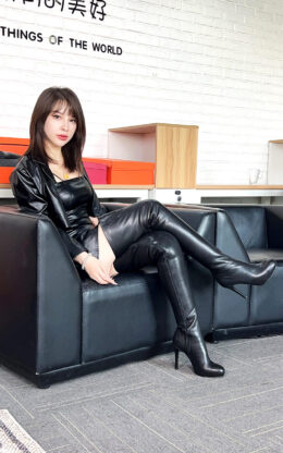 10CM细跟1CM内防水台 黑色高品质头层牛皮 内侧全拉链圆头大腿靴