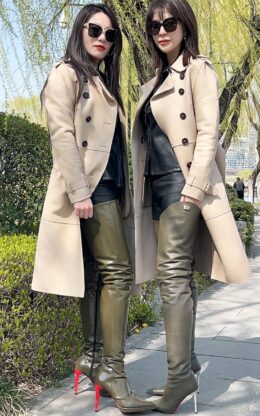 11CM细跟 1CM防水台 墨绿色高光泽开边珠牛皮 经典小尖头大腿靴