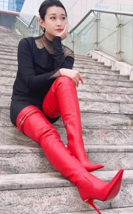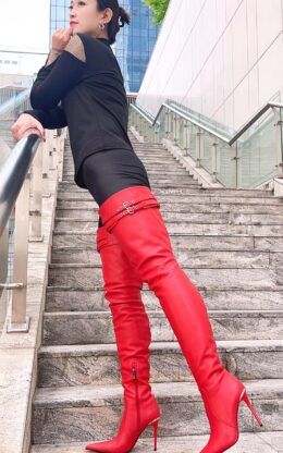 11CM 细跟 红色新芬达山羊皮14J-3 长尖头 大腿靴