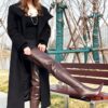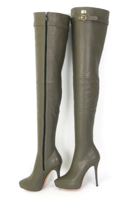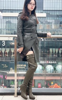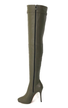 12CM细跟 2.5CM防水台 墨绿色高品质混种羊皮 稍钝小尖头皮带扣大腿靴
