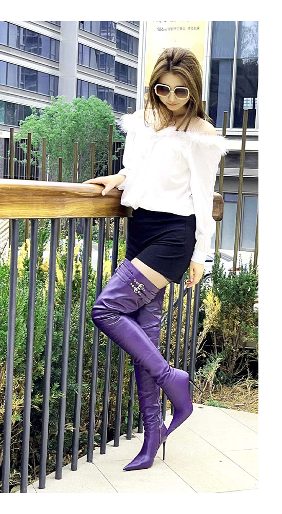 11CM细跟 紫色北冰洋BBY混种羊皮 长尖头 双皮带扣大腿靴
