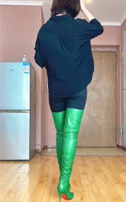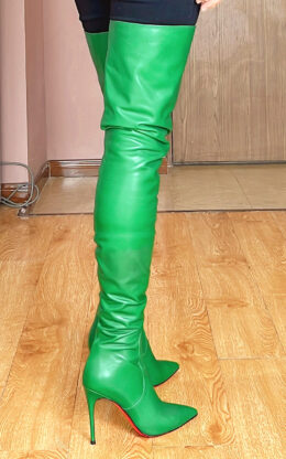 10公分鞋跟 绿色柔软肉感羊皮 小尖头大腿靴