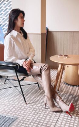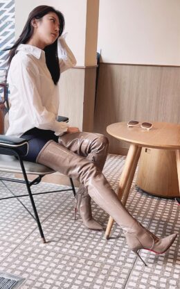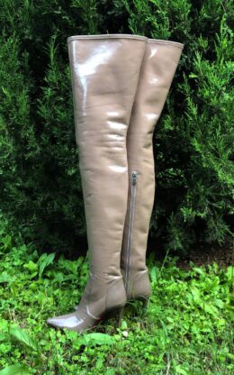 90%新现货:OBL-T-23998 浅棕色弹力漆皮小尖头大腿靴 10公分鞋跟