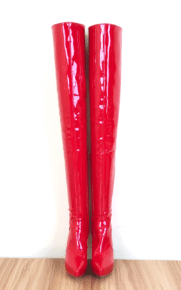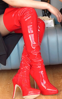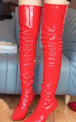 39码红色镜面漆皮 12cm高跟小尖头大腿靴
