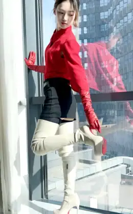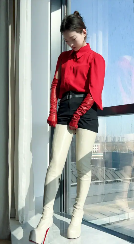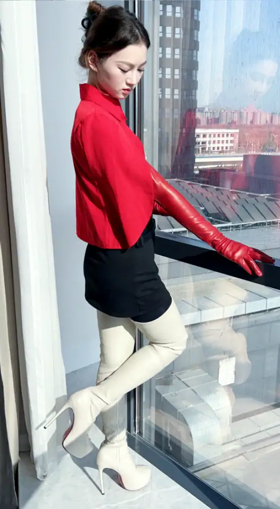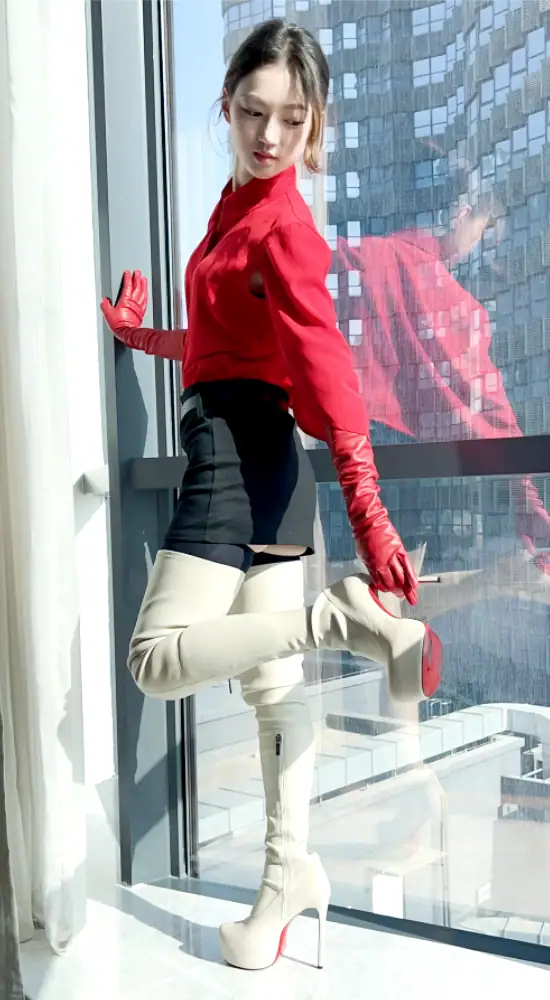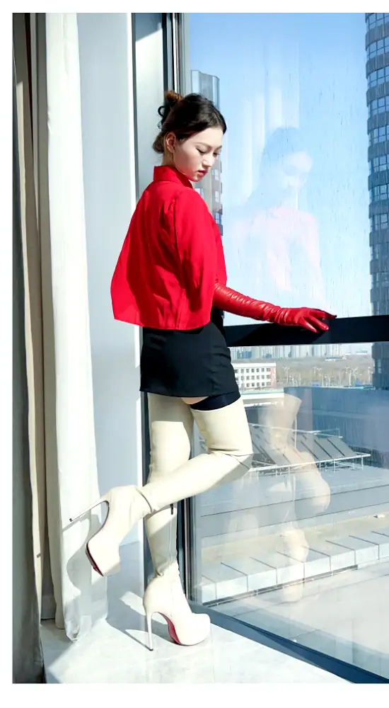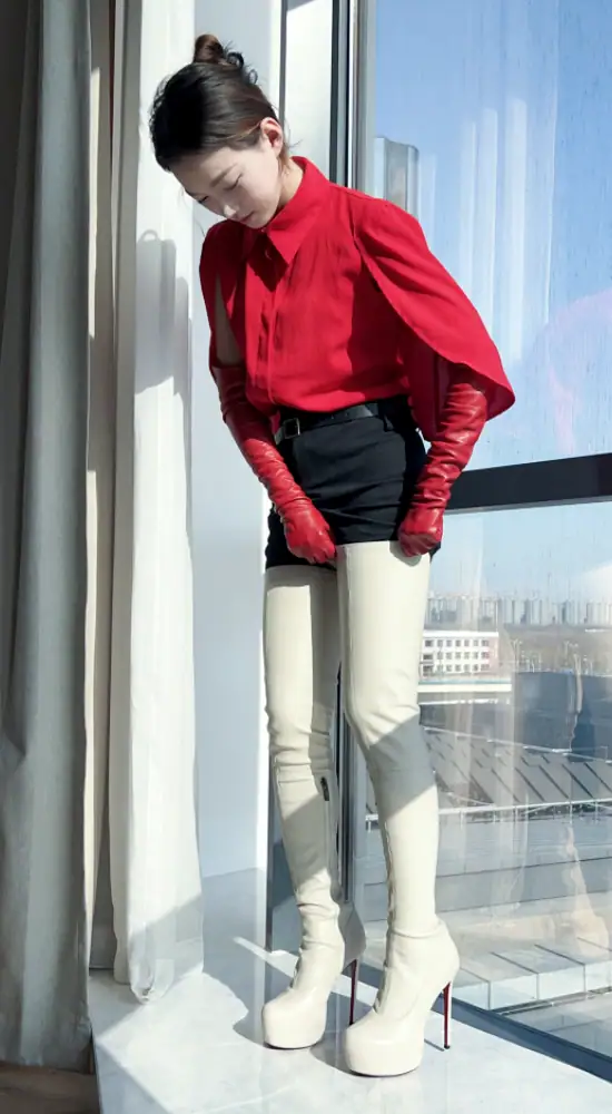 14CM高跟 4CM防水台 米白色高品质弹力羊皮 经典圆头大腿靴