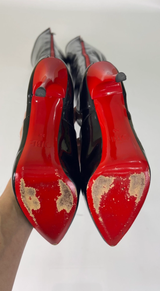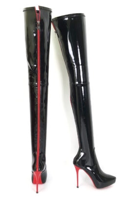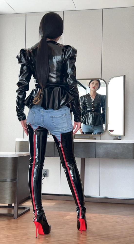 12CM细跟 2.5CM防水台 黑色镜面弹力漆皮 稍钝小尖头大腿靴