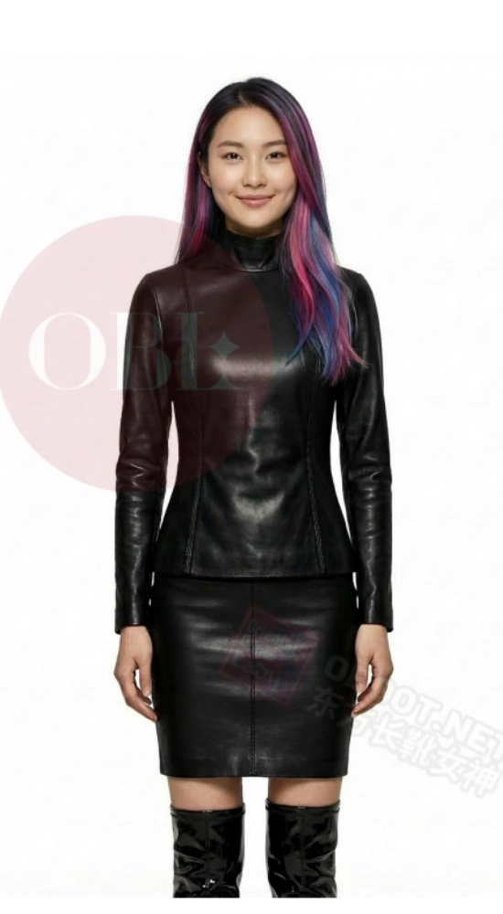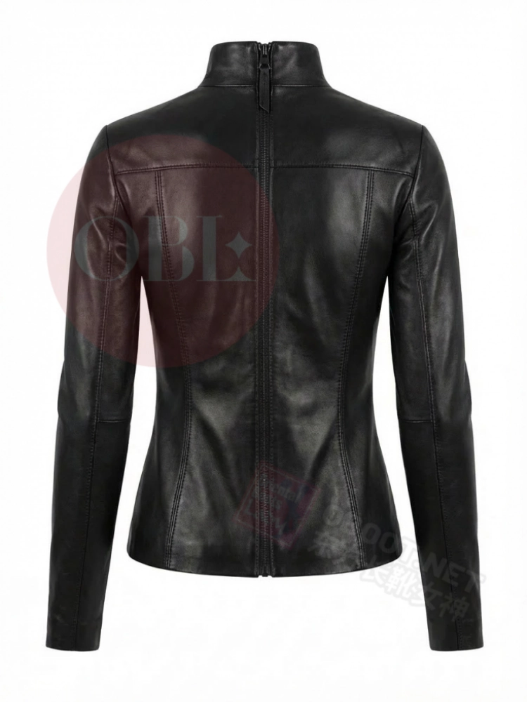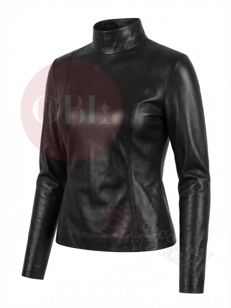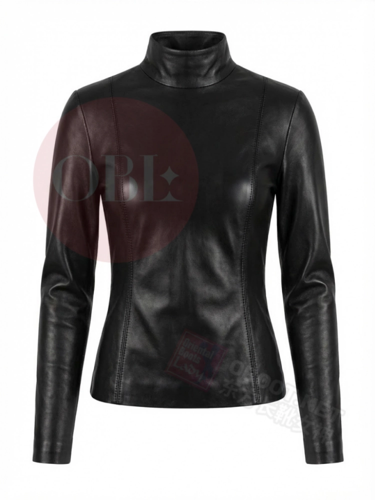 黑色高领修身羊皮上衣