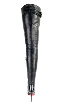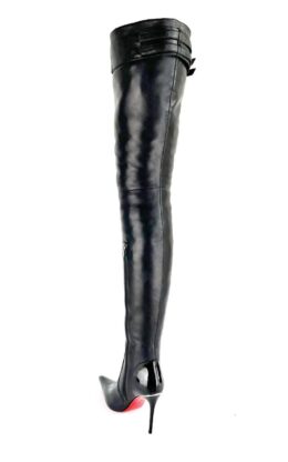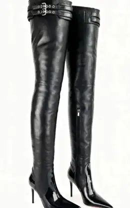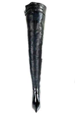 11CM鞋跟 黑色高品质混种羊皮 长尖头大腿靴  靴筒双排皮带扣
