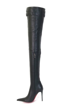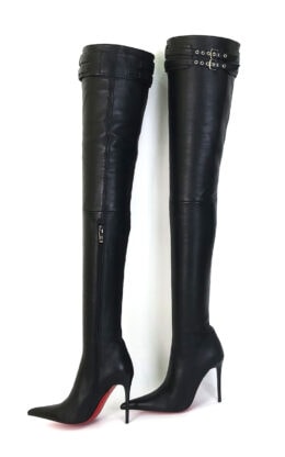 11CM细跟黑色高品质混种羊皮双排皮带扣 长尖头大腿靴