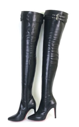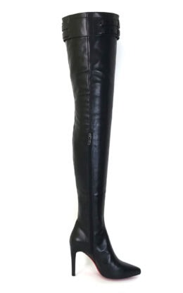 11CM细跟 1CM防水台 黑色高品质头层牛皮 双排皮带扣 经典小尖头大腿靴