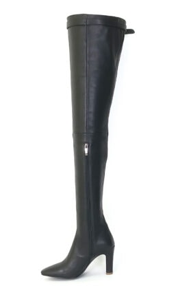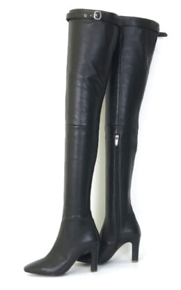 8CM细跟 黑色高品质混种羊皮 平直鞋头 单排皮带扣大腿靴
