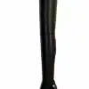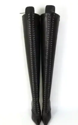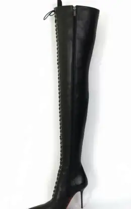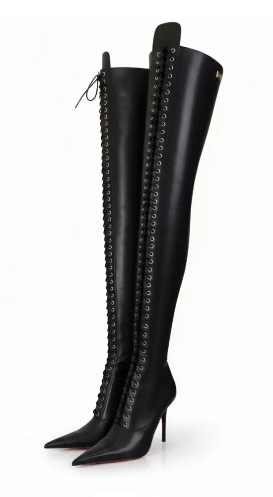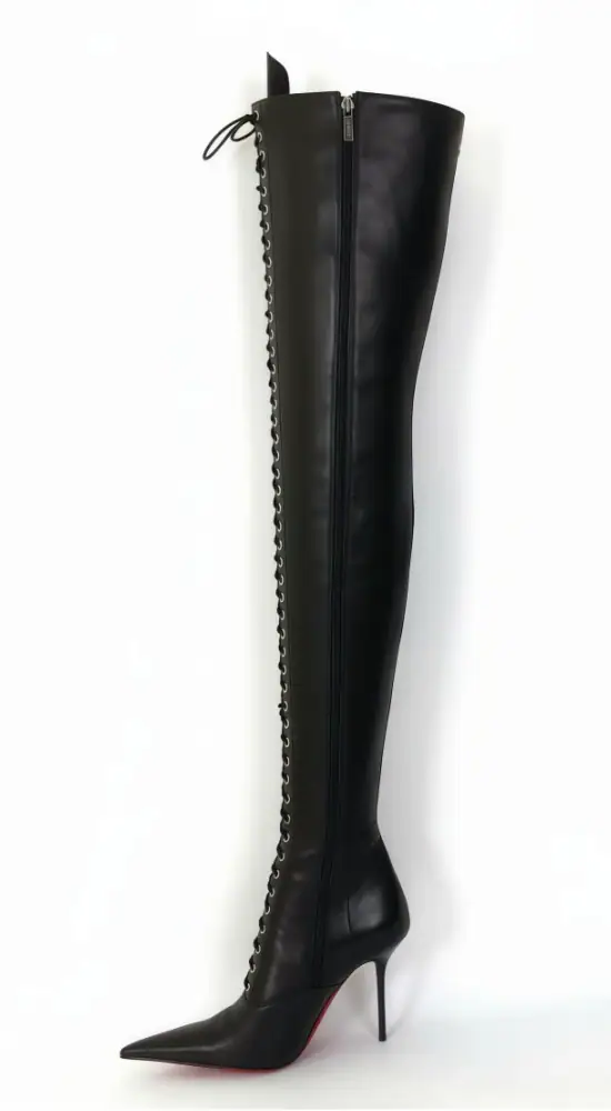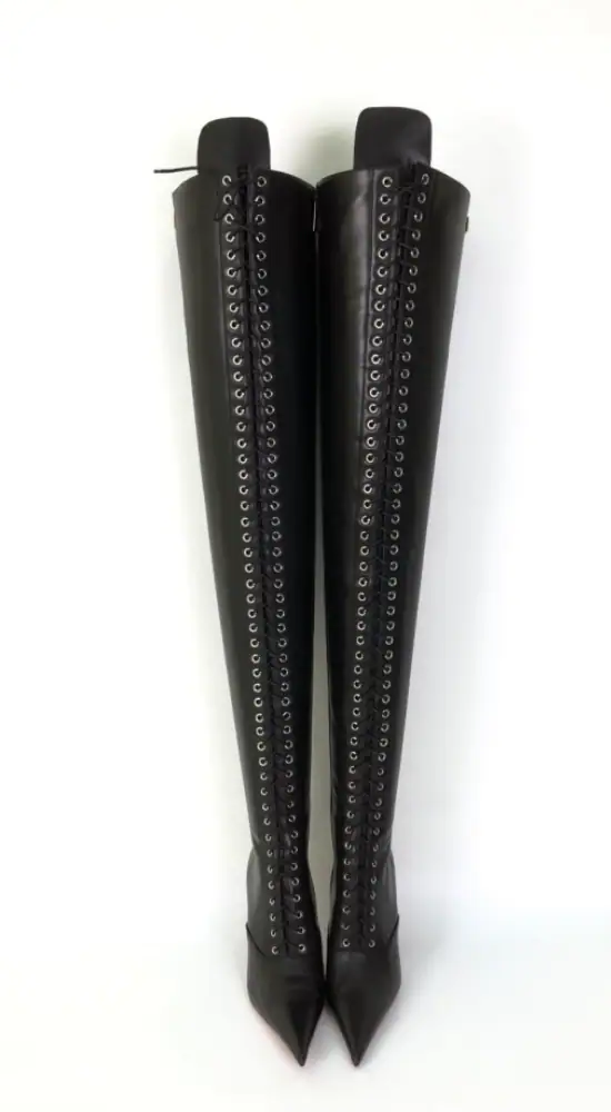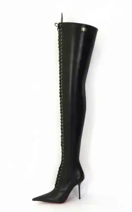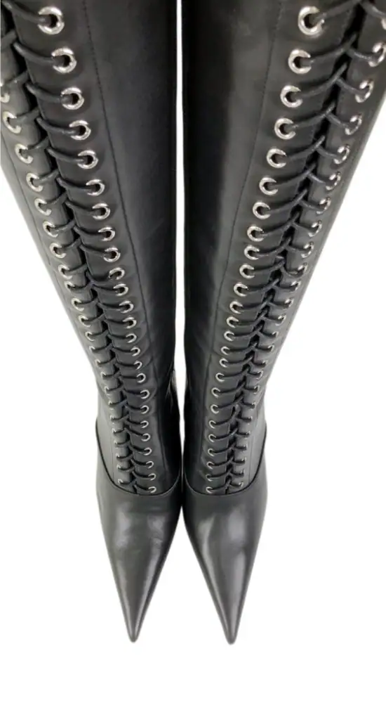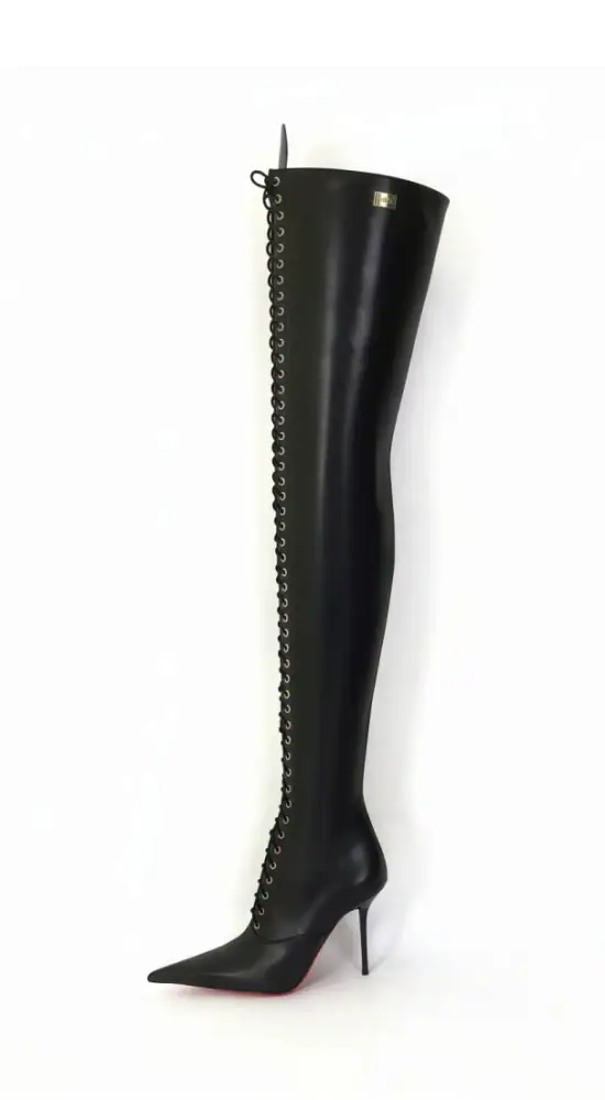 11公分细跟 黑色高光泽头层牛皮 长尖头长系带大腿靴