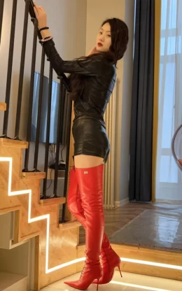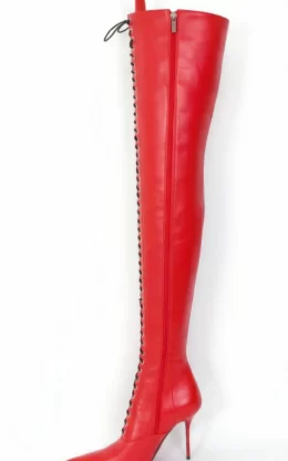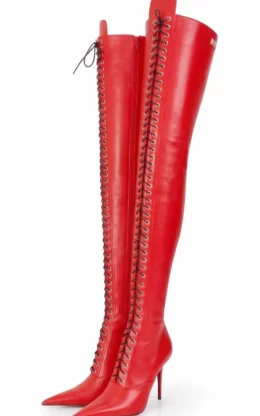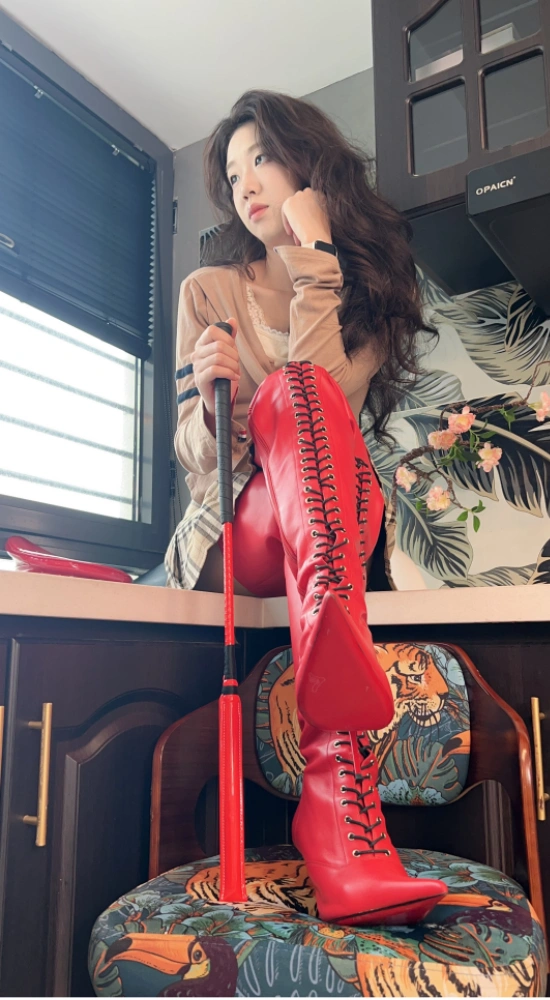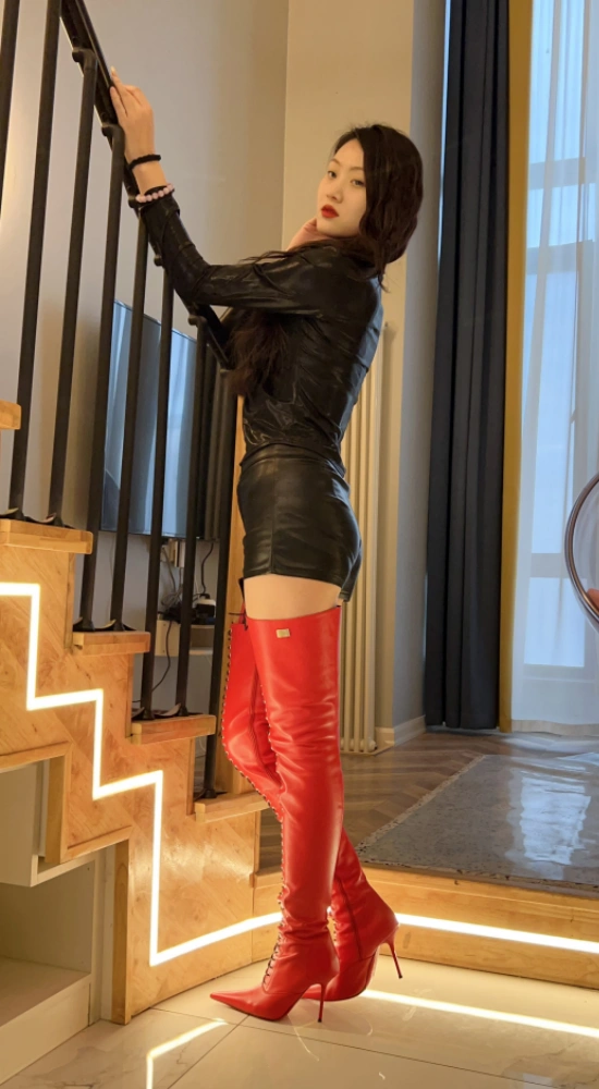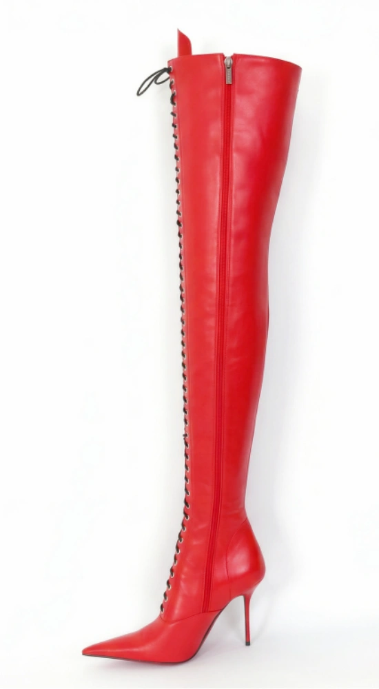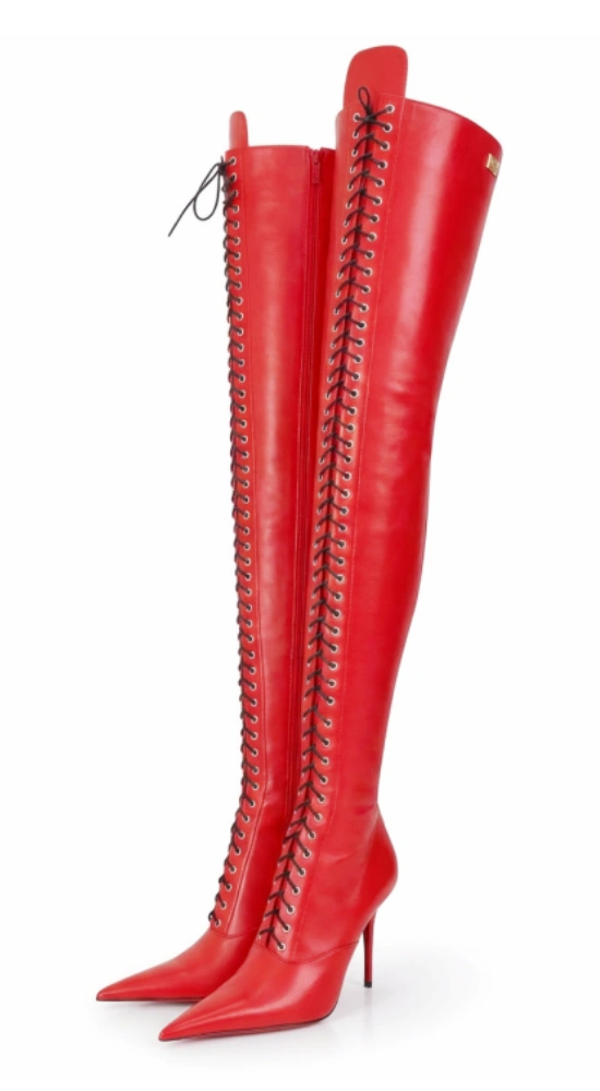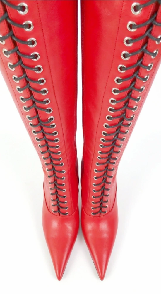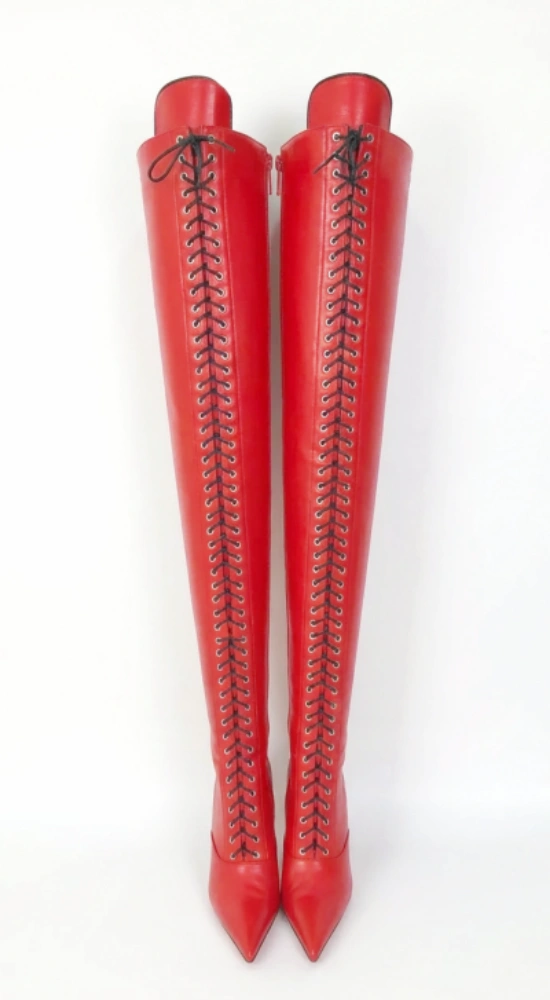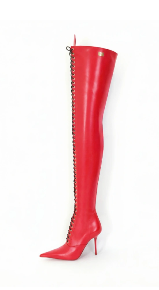 11公分细跟  红色高光泽头层牛皮  长尖头长系带大腿靴