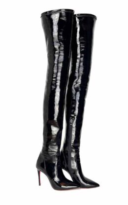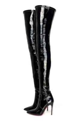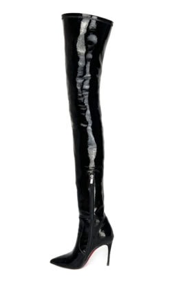 10公分鞋跟 黑色弹力镜面漆皮 小尖头 大腿靴,高弹力