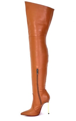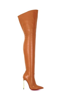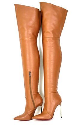 12CM 浅棕红色 高品质混种羊皮 标准短尖头 刀锋金属跟 大腿靴