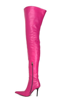 11公分鞋跟 桃红色高品质舒适牛皮传统长尖头大腿靴,皮革柔软