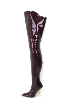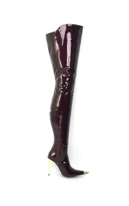 11CM鞋跟 酒红色珠光漆皮 金属长尖头 大腿靴