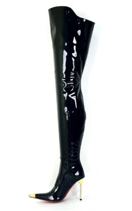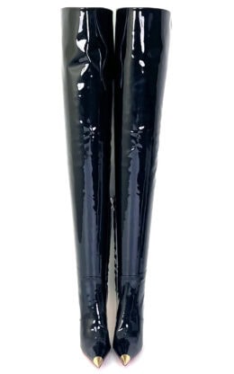11CM金属细跟 黑色无弹力镜面漆皮 长尖头大腿靴