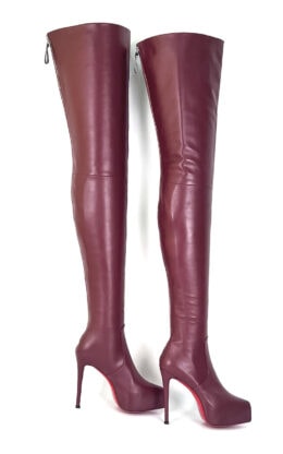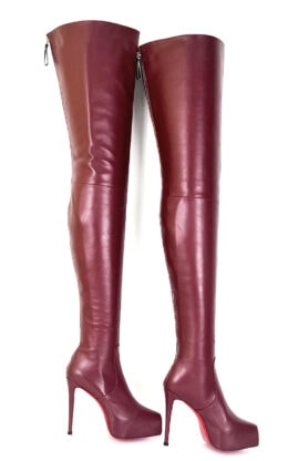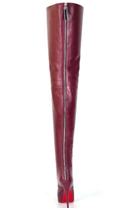 14CM高跟 4CM防水台 酒红色高品质光泽牛皮 稍钝小尖头大腿靴 后侧金属全拉链