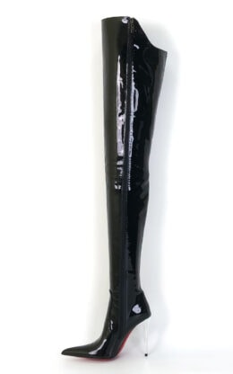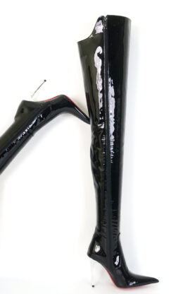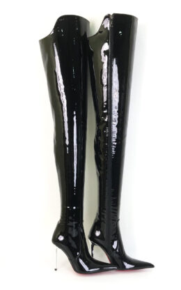 11CM金属细跟 黑色无弹力镜面漆皮长尖头大腿靴