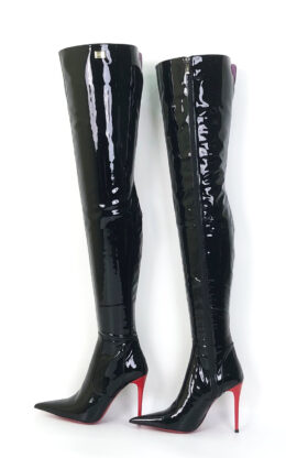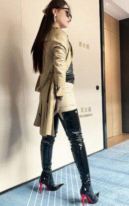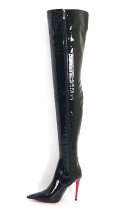 11CM细跟 黑色镜面无弹力漆皮 长尖头 大腿靴