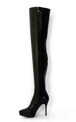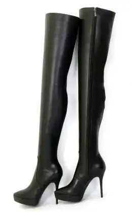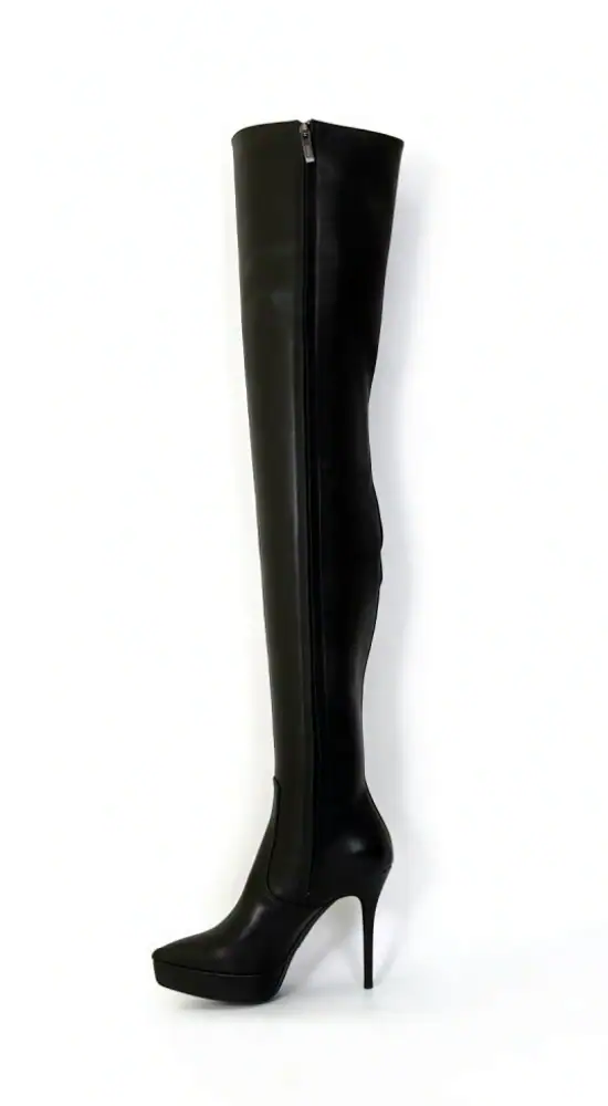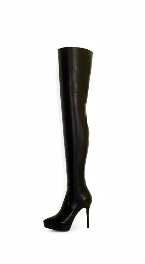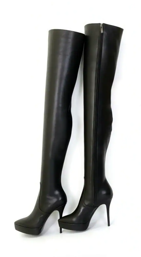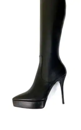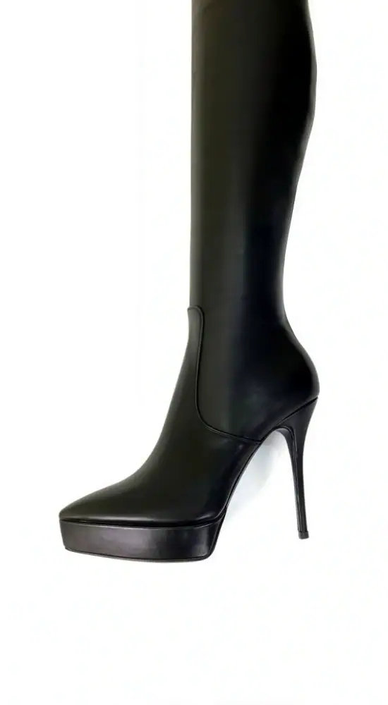 12CM细跟 2.5cm外防水台 黑色高品质头层牛皮 稍钝小尖头 大腿靴