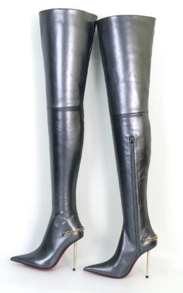 11CM金属细跟 高品质珠光银色山羊皮 长尖头 长系带大腿靴