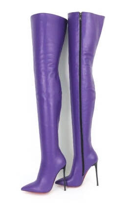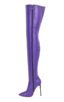 12CM细跟 紫色高品质光泽头层牛皮 经典小尖头大腿靴,整皮工艺