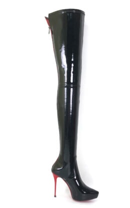 12CM细跟 2.5CM防水台 黑色镜面弹力漆皮 稍钝小尖头大腿靴
