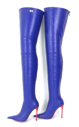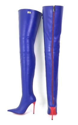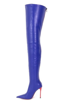 11CM红色细跟  蓝色高品质混种羊皮  长尖头大腿靴   鞋头无拼接  后侧红色全拉链
